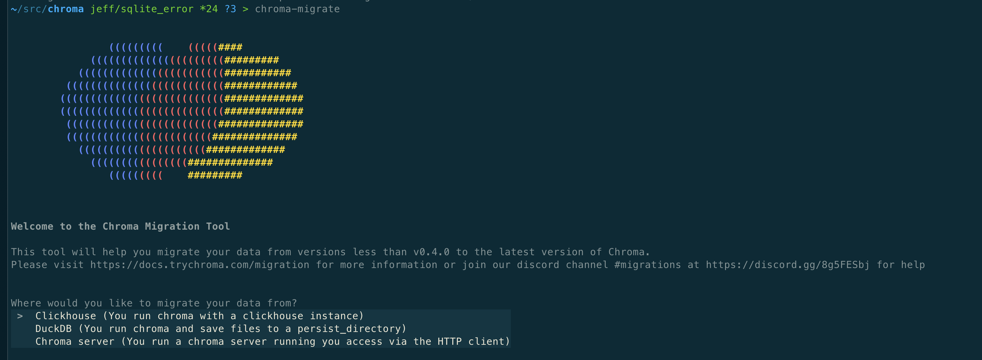 to upgrade your configuration. See https://docs.trychroma.com/migration for more information or join our discord at https://discord.gg/8g5FESbj for help!